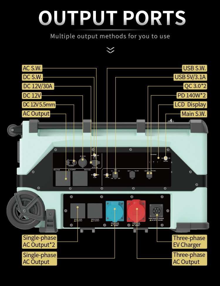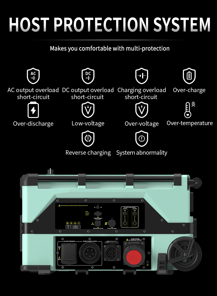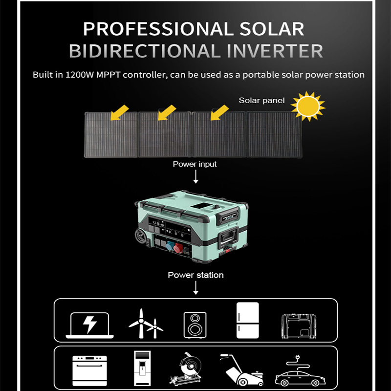 3.Support various fast charging methods such as utility, high-voltage solar, low-voltage solar, EV charger, driving car, AC generator and wind turbine.